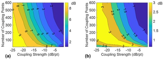 Then, we focused on the effect of NCP and CS on DMG reduction in strongly coupled FM-EDFAs. Figure 4 shows the calculated DMD results of both Type-A and Type-B 6-mode EDFAs. NCP and CS are in the ranges 10 to 600 and −25 to −1 dB/pt, respectively. It should be noted that there are little variations in the calculated DMG values at fixed NCP and CS, resulting from the randomness of the coupling matrix and the location of each point. We calculated the DMG at each NCP and CS an average of 100 times. In the uncoupled case, the DMGs of Type-A and Type-B fiber amplifiers were 9.3 dB and 2.4 dB, respectively, but it was greatly improved by strong mode mixing. In particular, for the Type-A EDFA, an 8.2 dB DMG reduction (i.e., from 9.3 to 1.1 dB) was achieved via strong mode mixing, and the DMG of Type-B EDFA was reduced to 0.5 dB with the aid of optimized Er-dopant distribution. Therefore, we can say that the proposed approach is very powerful for high DMG amplifiers, but it is also very useful to further reduce it in moderate-DMG amplifiers.