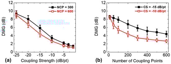 As mentioned before, NCP and CS are the key factors in reducing DMG. Considering the randomness of the coupling matrix and the location of each point, we then evaluated the DMG fluctuation of strongly coupled FM-EDFAs after 100 repeated calculations. We noticed that the DMGs of the two types of FM-EDFAs follow a similar trend as a function of NCP and CS (see Figure 4) and we chose a Type-A fiber amplifier (i.e., uniform doping), which is the most common and easiest to manufacture, for the following analysis. Figure 5 shows DMG and its corresponding standard deviation as a function of NCP and CS. As shown in Figure 5a, the DMG gradually decreases with CS and we can achieve a 7.8 dB reduction from 9.3 ± 0.3 to 1.5 ± 0.3 dB when NCP equals 300, as well as an 8.2 dB reduction when NCP equals 600. The DMG also decreases with NCP in Figure 5b from 8.6 ± 0.3 to 4.4 ± 0.7 dB when CS = −15 dB/pt and from 8.4 ± 0.5 to 2.7 ± 0.4 dB when CS = −10 dB/pt. It is worth noting that the standard deviation of DMG increased at the beginning due to the small number of NCP but decreased with NCP.