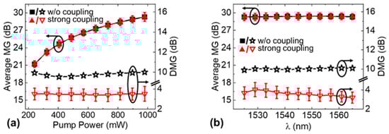 The average MGs and DMGs of (un)coupled FM-EDFAs were studied at different pump powers. As shown in Figure 6a, the average MGs in both cases are almost the same and the DMGs remained unchanged for pump power in the range of 200–1000 mW. Apart from low DMG, it was also important to obtain wideband operation and low noise figures (NF) for FM-EDFAs. Figure 6b shows the average MGs and DMGs over the full C-band. In both cases, the average MG spectra of the amplifiers was flat over the whole C-band and the wavelength dependence of the DMGs was also negligible. Thus, the gain bandwidth and flatness of the amplifier was not sacrificed via strong mode mixing in FM-EDFAs.