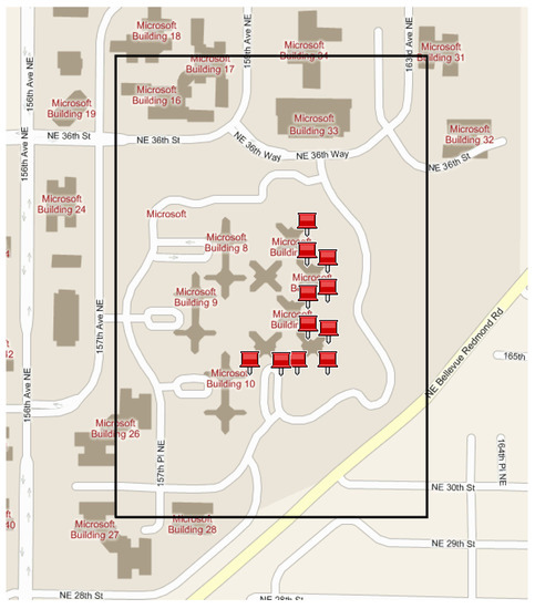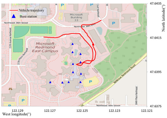 In this article, the data comes from the experiment of “data set collection based on Wi-Fi connectivity between vehicles and base stations in an urban environment” done by Microsoft Corporation in the United States. The experiment was completed in the Microsoft Experimental Park in Redmond, Washington. Using the experimental results of vehicle wireless locations in the vehicle road cooperative environment, the algorithm verification of this article is completed. There are 11 Wi-Fi fixed base stations set in the experimental park to transmit wireless signals; the red mark in Figure 2 below marks the base station setting.