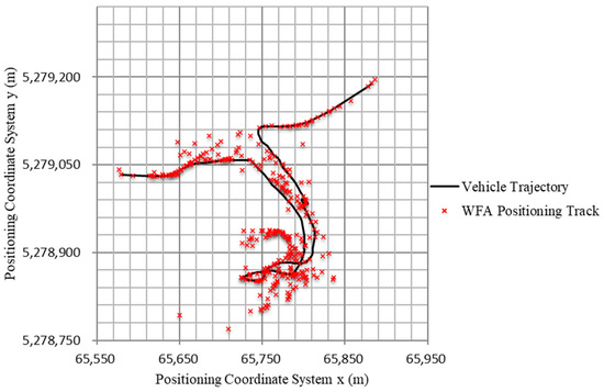 where and are the vehicle positioning coordinates located by the trilateral measurement method and the least-squares method, and are the weighting factors of the trilateral measurement method and the least-squares method. It can be obtained that the positioning coordinate of the WFA fusion positioning scheme is . Furthermore, indicates the positioning error distance, and indicates the real vehicle position.