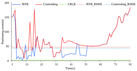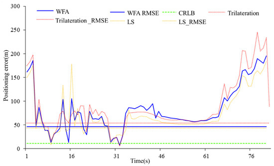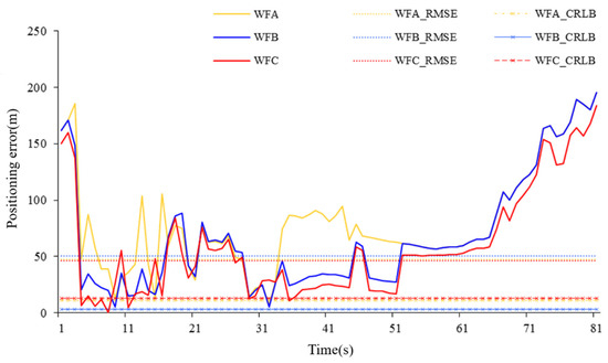 Comparing the positioning results of the three fusion positioning schemes—WFA, WFB, and WFC, Figure 13 shows the comparison of the accuracy evaluation indexes of the three positioning schemes. The figure shows the comparison results of the positioning error, RMSE, and CRLB of the three fusion positioning schemes.