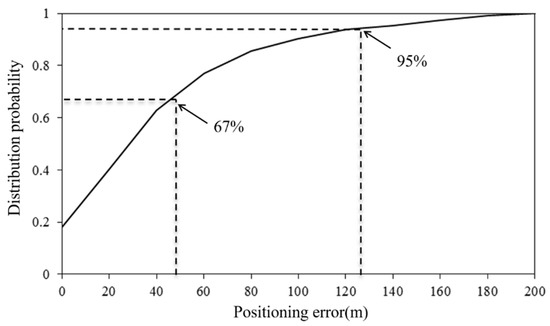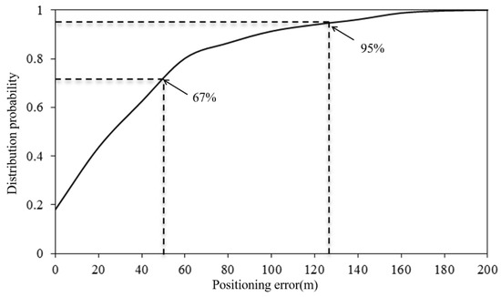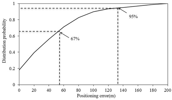 Figure 12 is the CDP function diagram of the WFC fusion positioning scheme. It can be seen from the figure that the positioning error of the WFC fusion scheme is relatively concentrated in the range of 0–40 m. From the CDP, 67% of the positioning accuracy is within 46.31 m, and 95% of the positioning accuracy is within 122.53 m.