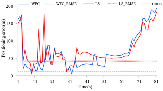 Among the three positioning schemes in Table 9, the WFC fusion positioning scheme has the best positioning effect, the WFA fusion positioning scheme is in second place, and the WFB fusion positioning scheme has the lowest positioning accuracy. The positioning accuracy of the WFC fusion positioning scheme can reach 39.97 m, and the positioning accuracy of the WFA and WFB fusion schemes can also reach 43.32 and 48.56 m, respectively. Compared with the better schemes in the WFA and WFB schemes, the WFC scheme is significantly improved in terms of mean, CRLB lower limit, GDOP, and CDP, proving the positioning superiority of the WFC scheme. Among them, the average positioning error is improved by 7.74%. The RMSE dropped by 2.92%, indicating that the error convergence of WFC is the best. The CRLB increased by 15.82%, indicating that the standard deviation of the WFC scheme is closer to the CRLB lower limit, and the positioning error is smaller. The GDOP decreased by 23.26%, indicating that the influence of the relative location between the vehicle and the base station on the positioning accuracy is reduced. In the WFC fusion positioning scheme, 67% of the positioning accuracy reached 46.31 m, and 95% of the positioning accuracy reached 122.53 m.