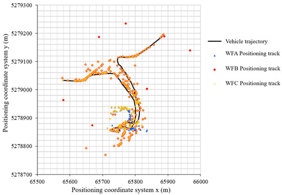 Figure 14 shows the positioning trajectory diagrams of the three fusion positioning schemes. It can be seen from the figure that the positioning trajectory of the WFC fusion positioning scheme is the closest to the real driving trajectory of the vehicle, and the positioning accuracy is the highest.