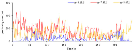 Based on the WFC fusion positioning scheme based on the optimal positioning result, the environmental impact indicator and the path loss coefficient n in the model are taken as different values, and the positioning errors are respectively calculated for comparison. The original data of the same period are selected and calculated according to the positioning method in the WFC fusion positioning scheme.