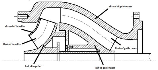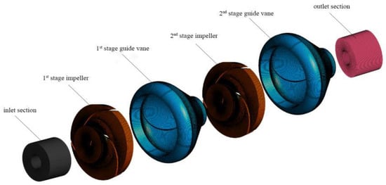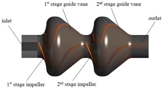 In the numerical simulations, the full flow field computational domain includes the inlet section, the first-stage impeller, the first-stage guide vane, the second-stage impeller, the second-stage guide vane, and the outlet section, as shown in Figure 2. The overall structure model is shown in Figure 3.