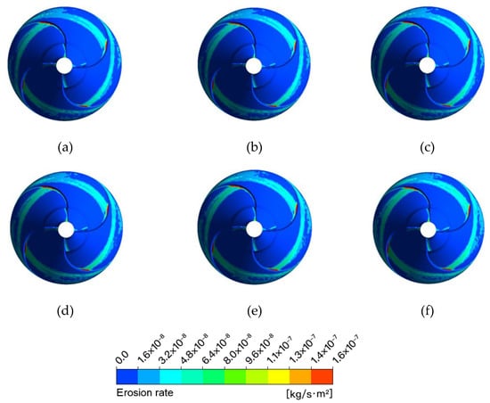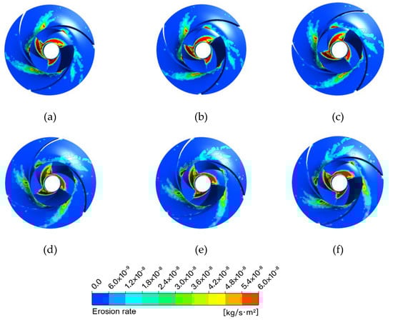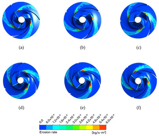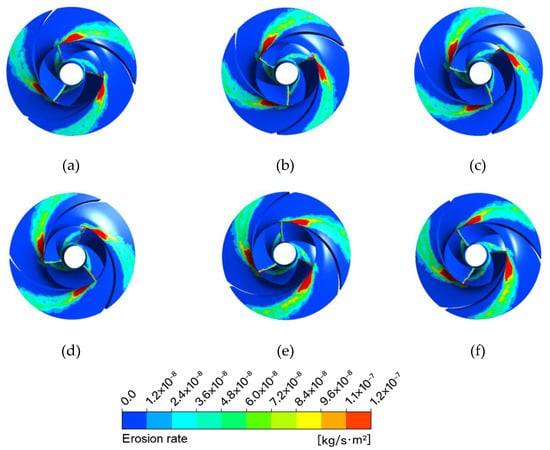 Surface wear rate evolution of the second-stage impeller. (a) 0°, (b) 24°, (c) 48°, (d) 72°, (e) 96°, (f) 120°.