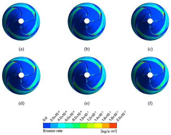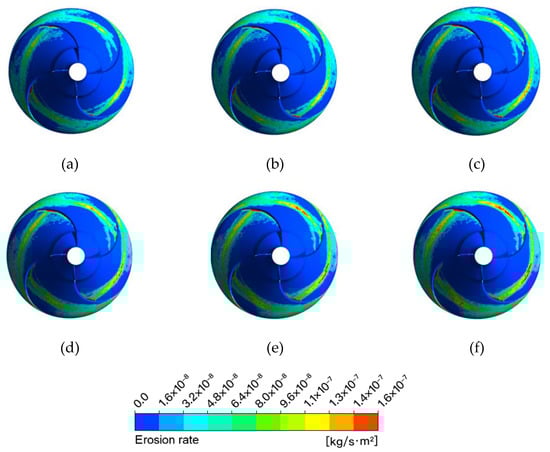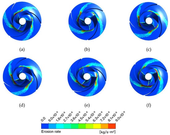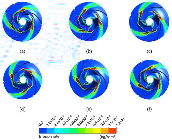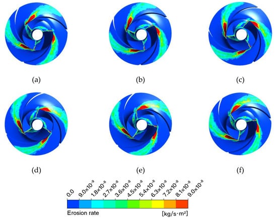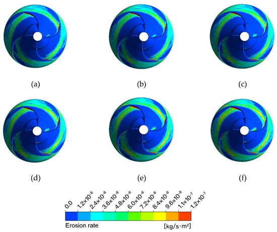 Surface wear rate evolution of the first-stage impeller. (a) 0°, (b) 24°, (c) 48°, (d) 72°, (e) 96°, (f) 120°.