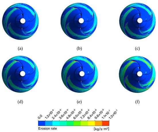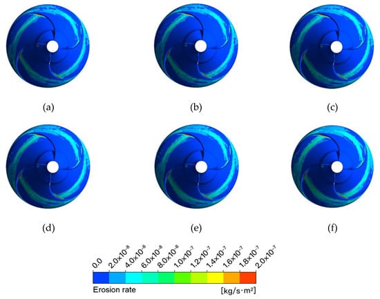 The wear due to particles on materials is extremely complicated as it is affected by the particle size, density, concentration, and impact angle and different operating conditions. The different particle parameters and operating conditions can lead to different degrees of wear [,,]. Similarly, particles will also cause different degrees of wear in a pump, which wear is mainly manifested on the surface and inside of the flow passage components. In practical engineering applications, the wear characteristics of particles on a pump under different operating conditions cannot be ignored as they are directly related to the service life and reliability of the pump [,,].