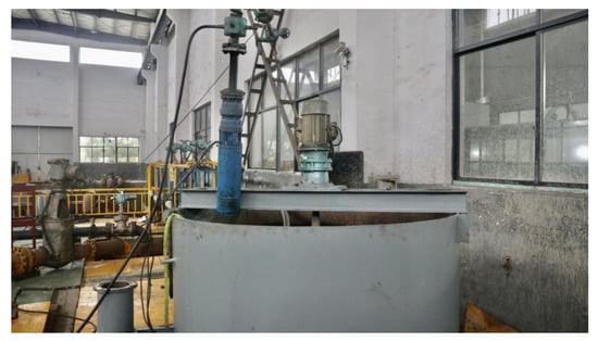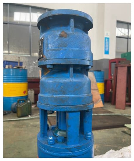 Due to the long manufacturing process of the deep-sea mining pump, the conditions for the wear test are not yet available. In order to verify the validity of the numerical calculation method and the wear model used in this article, we made a small test pump with the same specific speed as and a similar structure to that of the deep-sea mining pump for the wear test. In order to facilitate verification, we used a qualitative wear test that has been used in many studies [,,]. The actual test pump is shown in Figure 16.