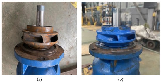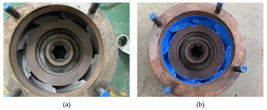 Comparison diagram of the impeller runner before and after applying water-based paint. (a) Before painting, (b) After painting.