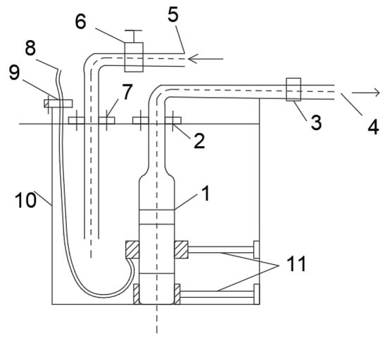 Test system diagram. 1—Test pump (including motor); 2—Test pump support mechanism; 3—Flow meter; 4—Outlet pipe; 5—Return pipe; 6—Regulating valve; 7—Return pipe support member; 8—Cable terminal; 9—Cable fixing component; 10—Water tank; 11—Anti-submersible pump swing component.