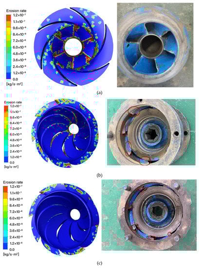Comparison of numerical calculation results and test results of the wear area. (a) Impeller inlet, (b) First-stage guide vane, (c) Secondary guide vane.