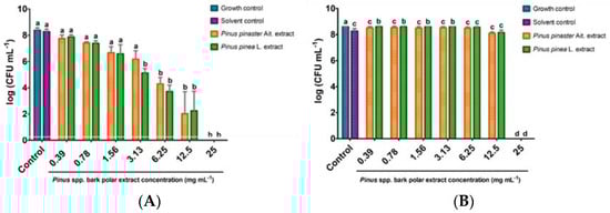 Inhibitory effect of Pinus pinaster Ait. and Pinus pinea L. bark polar extracts against the growth of (A) S. aureus (ATCC® 6538) and (B) E. coli (ATCC® 25922). The solvent control represents the bacterial growth under 12.5% (v/v) ethanol. The columns and bars depict, respectively, the mean and the mean-standard of the error of three independent experiments performed in triplicate. Columns with different letters are statistically different from the solvent control (unidirectional ANOVA followed by Duncan’s Test; p < 0.05). CFU, colony forming units.