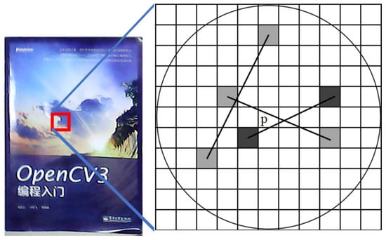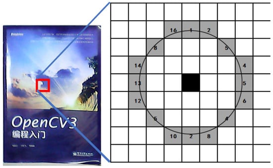 The specific calculation process of fast is as follows: First, select a pixel point P from Figure 1 and judge whether it can be used as a feature point. It is assumed that its gray value is M. Set a suitable threshold value V (for example, 20% of M). When the absolute value of the difference between the gray values of two points is greater than V, then these two points can be considered to be different. Then, taking the pixel point P as the center, select 16 pixels on a circle with a radius of 3. P can be regarded as a corner point if the gray levels of consecutive L points in these 16 pixels are all larger than M + V or smaller than M − V. Here, L is set to 12 and if at least 12 points exceed the threshold, P is considered as a feature point, Otherwise, it is considered that P is not a feature point. To obtain faster results, additional acceleration measures have also been adopted. If four points around the candidate point are tested at 90-degree intervals, at least three points should have enough difference with the gray value of the candidate point; otherwise, the candidate point should not be considered as a feature point without calculating other points. Figure 1 is a schematic diagram of fast feature point extraction.