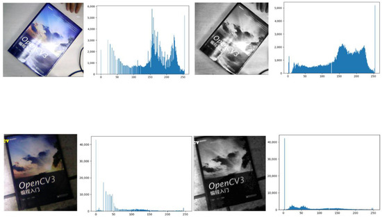 Due to shooting or environmental problems, there may be uneven image brightness, low contrast, high noise, and so on. The features after matching with the original image are concentrated in the areas with high contrast, while the features extracted from other areas are relatively few, so the obtained feature points cannot describe the whole image. The histogram distribution of the original image is shown in the upper-left picture and the bottom-left picture in Figure 4. Although ORB feature matching has a good matching effect under good illumination, the matching effect will be greatly reduced under insufficient illumination or overexposure.