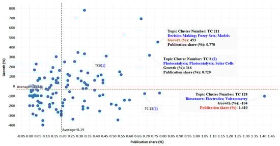 From Figure 1, the topic clusters of decision-making, fuzzy sets, and models (TC 211) belong to the star category (high market share and high growth rate), but the biosensors, electrodes, and voltammetry (TC 128) belong to the cow category (high market share and low growth rate). Photocatalysis, Photocatalysts, and Solar Cells (TC 8) are stable between good quality and good quantity (the second most frequently occurring subject of papers).