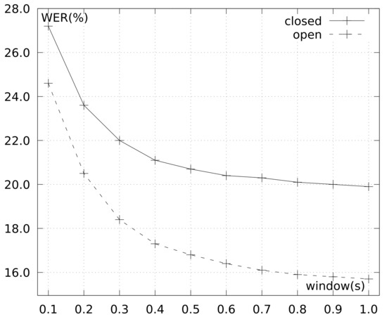 WER as a function of system latency (in seconds) for the closed-condition systems (solid line), computed over the dev1-dev set by trying different values for the search (pruning) parameters. An acoustic window size of 0.6s was used in all cases (plotted points). For comparison, relevant results for the open-condition systems are also shown (dashed line).