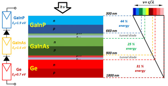 Figure 2 presents a model of the structure of a single three-junction cell, which considers the ranges of absorbed radiation for three successive layers of semiconductors. Figure 2 gives the values of Eg energy gaps for each layer and the percentage of absorbed energy reaching the cell in the form of concentrated solar radiation. The operating principle of this type of cell is that the size of the energy gap (Eg) decreases in the direction consistent with the penetration of radiation. The purpose of building such structures is to absorb the broadest possible spectrum of solar radiation reaching the outer surface of the module.