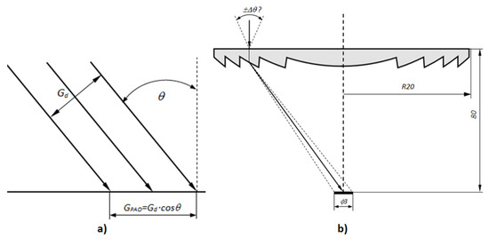 Figure 3 shows the radiation distribution patterns for an incident angle of radiation deviated from the perpendicular to the surface of a classical PV module (Figure 3a) and the operating principle of a point-focused Fresnel concentrator (Figure 3b). The diagram shown in Figure 3b indicates the limited range of angle (±Δθ) of incidence of radiation that can fall in the C3PV cell area. A larger deviation of the incident angle causes the radiation to fall outside the C3PV cell area.