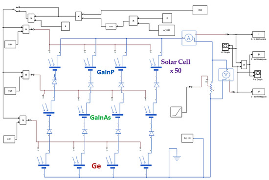 The novelty of the proposed model is that a standard module of the Matlab/Simulink package “Solar Cell” was used to build a three-junction cell model (C3PV). The model is relatively simple and allows other researchers to continue verification studies for similar custom solutions. The “Solar Cell” component was developed based on the classical model of a dual diode PV cell. Adapting the proposed model for other multijunction cells requires the determination of the range of the angle of deviation from the direction of perpendicular incident radiation and the degree of focusing. If the module manufacturer provides these data, they can be directly implemented in the model.
