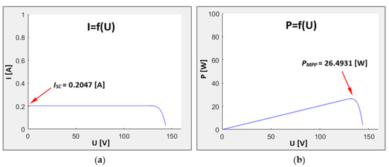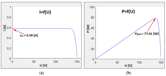 Simulation results for nominal parameters of CX-75/200 module: (a) current–voltage characteristic curve I = f(U); (b) power diagram P = f(U).
