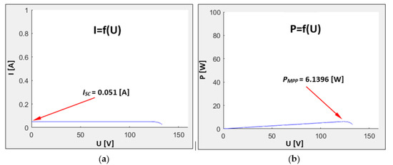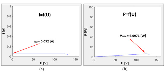 The simulation model proposed in this paper was subjected to preliminary verification. The comparative material was the nominal parameters of the CX-75/200 module, given in Table 2, which were tested under the conditions given by the manufacturer (850 W/m2, cell temperature 25 °C, and AM 1.5). The simulation results obtained for the nominal parameter values are shown in Figure 5.