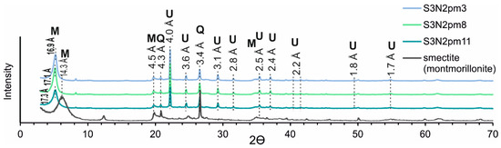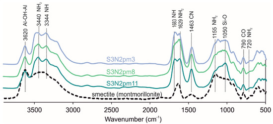 The composites of S3N2pm3/8/11 (Figure 4) show minor changes of low wavenumber with increasing activation time. FTIR spectra of composites include peaks of CO at 790 cm−1 and Si-O stretching at 1050 cm−1. All composites show a gentle peak at 720 cm−1 (NH2). The NH2 peak is identified at 1155 cm−1 in all the composites. Composites exhibit the asymmetric deformation of the C–N at 1463 cm−1. Peaks at 1629–1650 cm−1 (NH2) and the flat 1662–1683 cm−1 (NH) are distinctive of the composites. These two peaks appear stronger in S3N2pm11 compared to S3N2pm 3/8. FTIR peaks of S3N2pm11 characteristically exhibit a peak at 3344 cm−1, probably reflecting the nitrogen coating. The NH2 peak shifts from 3485 to 3440 cm−1 with increasing grinding time. All composites show a peak of 3620 cm−1, which is associated with IR-vibration Al-OH-Al of montmorillonite.