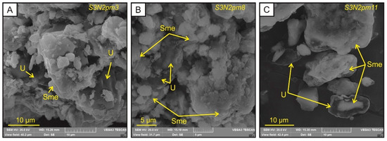 SEM images of composites S3N2pm3 (A), S3N2pm8 (B), and S3N2pm11 (C). Note the thicker urea coating in S3N2pm11 compared to other composites. U—urea particles, Sme—smectite (montmorillonite) relics.