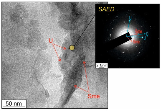 The composite includes relics of smectite particles and flakes (Figure 2). A nitrogen coating mantles mineral micro-aggregates in S3N2pm11. The length of the mineral micro-aggregate’s ranges from 10 to 200 µm. The urea coating may be up to 5 µm thick (Figure 2C). The urea coating thickens gradually as the operation time increases. The adsorbed urea crystallites within the coating have diameters ranging from 30 to 80 nm. They are admixed with nanoparticles of smectite (Figure 3). TEM images with SAED (Figure 3) show distinctive interplanar spacings for the following minerals: smectite of 17.1 Å and 4.5 Å; and urea of 3.6 Å, 3.1 Å, and 2.8 Å.
