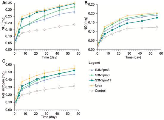 The release of nitrogen from the composites was studied by the soil column leaching experiment (Figure 6). The release of ammonium (NH4+) from the composites was faster in the first 7 days than in the remaining period (Figure 6A). The ammonium content in the leached solution was almost similar in the first few days for all composites. After the first week, the composite S3N2pm11 released higher NH4+ relative to others. The leaching rate of ammonium was stable after the 28th day for all samples, which was followed by the overlapping leaching curves (Figure 6A). The urea control released ammonium at the fastest rate at each stage of the experiment. The release of nitrates took place at different rates during the experiment (Figure 6B). The nitrate was leached in four steps, namely: up to the 7th day, from the 7th to 21st day, from the 21st to 28th day, and from the 28th to 56th day. However, the urea control released the most nitrate at all stages. The composite S3N2pm11 released nitrate at the slowest rate. The rate of release of nitrate stabilized after the 28th day for all samples. The total nitrogen was released in four stages, following the similar fashion of nitrate release (Figure 6C).