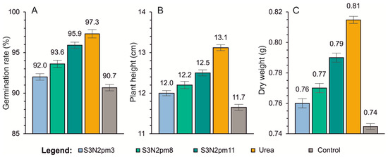 Histograms showing the % increase of (A)—germination rate, (B)—seedling height, and (C)—dry weight of oat (Avéna satíva). Note that urea and composites are equally effective fertilizers for plant growth. Further note that the composite S3N2pm11 is the most effective for plant growth as it records the maximum increase of all three parameters. The statistical significance of every parameter indicates at the p = 0.05 level. Bars represent standard deviation.