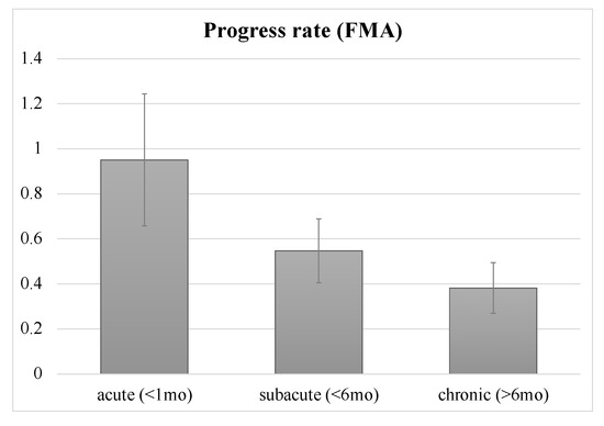 Progress rate of patients at acute, subacute and chronic phases. Error bars indicate standard errors. There were no significant differences, only a trend, among the three phases. FMA: Fugl-Meyer motor assessment scale for upper extremity; mo: month.