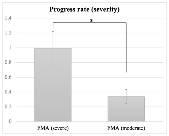 Progress rates of patients with severe and moderate paresis. Error bars indicate standard errors. Significant difference is denoted by *; FMA: Fugl-Meyer motor assessment scale for upper extremity.