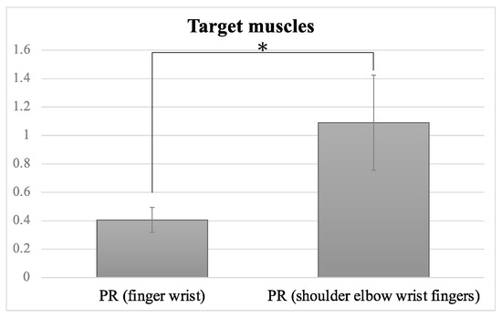 Progress rates (PR) of different target muscles. Error bars indicate standard errors. There was a significant difference between the finger and wrist flexors/extensor group and the whole-UE (shoulder, elbow, wrist, fingers) group. Significant difference is denoted by *.