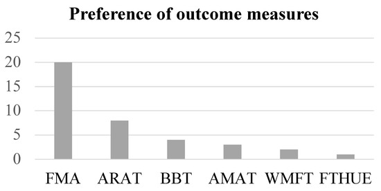 The preference of outcome measures used is shown. FMA: Fugl-Meyer motor assessment scale for upper extremity; ARAT: action research arm test; BBT: box and block test; AMAT: arm motor ability test; WMFT: Wolf motor function test; FTHUE: functional test for hemiparetic upper extremity.