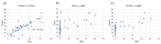The most frequently used measure was FMA (20/23 trials) among the included studies. The Action Research Arm Test (ARAT) followed (seven trials) (Figure 5). Four studies used the box and block test (BBT) and two studies selected the Wolf motor function test (WMFT). According to data from Obayashi et al. [11,32], the FMA scores were closely associated with those of WMFT (R2 = 0.723) (Figure 6a). By contrast, both the FMA and WMFT scores showed no association with the BBT scores (Figure 6b,c).