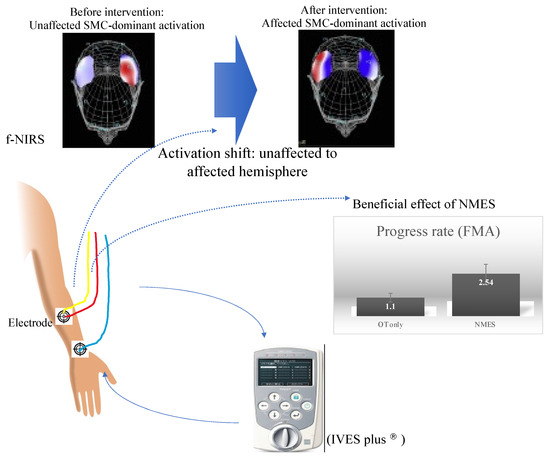 NMES setting (placement of electrodes applied to FDS) and neural basis underlying the beneficial effect of NMES on motor recovery. The scheme illustrates that NMES, when applied to affected forearm muscles, can facilitate motor recovery as shown by augmented PR and subsequently generate cortical reorganization of affected SMC activation, revealed by f-NIRS. FDS: flexor digitorum superficialis; SMC: sensory-motor cortex.