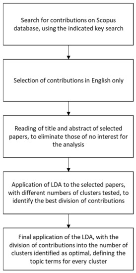 The sections of this paper are organized as follows. Section 2 will present the methodology followed, both from the point of view of structuring the literature review and from the point of view of applying the LDA algorithm. Section 3 will present the evidence extracted from the literature, detailing the different topics identified. Finally, the discussion and conclusions section is presented, highlighting the extracted contents, their possible application in the maintenance field, and possible future developments of the research.