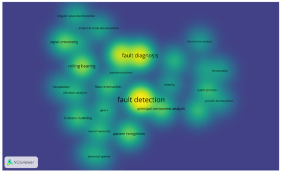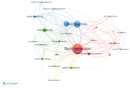 Moreover, the graphical analysis evidences the connections between the keywords. The “rolling bearings” are closely linked to the concept of “vibration”, “feature extraction” and the “k-means algorithm”. Another connection is available between the concept of “batch processes” and “fermentation processes”, which is also related to the technique of “principal component analysis” and the concept of “discriminant analysis”. Similarly, the “signal processing” forms a cluster with “singular value decomposition” and “empirical mode decomposition”. Finally, as one might expect, the themes of fault diagnosis and fault detection are extremely cross-cutting. This is not surprising, as they are two of the main objectives of condition monitoring. the concept of feature extraction, although important, is less transversal and more circumscribed than the two mentioned above.