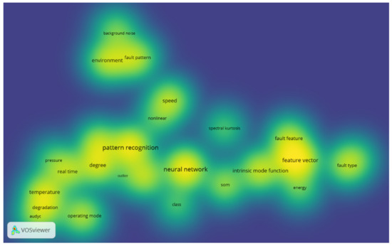 This analysis takes up the keywords considered above, but in this visualization the color represents the density of every item. By default, colors range from blue to green to yellow. The larger the number of items in the neighborhood of a point and the higher the weights of the neighboring items, the closer the color of the point is to yellow. For the other way around, i.e., the smaller the number of items in the neighborhood of a point and the lower the weights of the neighboring items, the closer the color of the point is to blue. Evidence are that, apart from fault detection, fault diagnosis and rolling bearings, all other terms have the same density of occurrence.