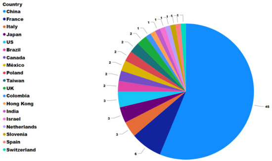 A geographical analysis of contributions shows that publications still take place in very scattered and varied journals, just as no specific cluster is currently identified for authors. For this reason, it was decided to shift the focus to the afferent nations of the research centers, as shown in Figure 5.