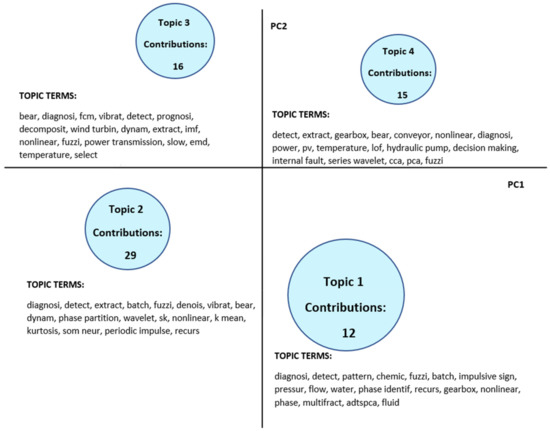 In the third analysis of Figure 4, it was decided not to consider the words that were already highlighted in the previous analysis. In this way, it was possible to identify several new concepts, more specific than those identified with the keywords. Precisely because of the specificity of these terms, it was decided not to consider the relationships between the words, as done in Figure 3, since it this could lead to unhelpful and misleading considerations. Indeed, considering the thematic breadth, nuances and connections would be lost. In this analysis, specific process parameters can be identified, such as speed, pressure, temperature, or energy. Beyond that, the problem of background noise becomes apparent, related to the concept of the working environment and the non-linear processes. If attention is focused, however, on the concept of fault detection and fault diagnosis, some more peculiar concepts emerge, including: pattern recognition; degradation; class, meaning fault class; degree, meaning the level of gravity of a fault; fault feature; feature vector; fault pattern; fault type; or operating mode. As far as techniques and methods are concerned, the presence of the AUDyC algorithm, the spectral kurtosis, the self-organizing maps, and the intrinsic mode function is revealed. Finally, the concept of real-time application and outlier is identified by the analysis. This analysis is a first investigation of the thematic area, based on the occurrence of terms. Thus, through the LDA, it will be possible to analyze the contributions in more depth, also showing the thematic connections. The results obtained from this first investigation, however, already allow a wide-ranging vision of themes that are present and treated in the selected contributions.