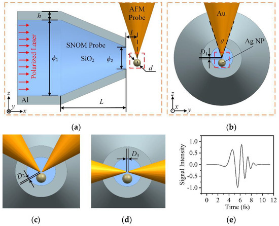 The simulations of near-field nano-manipulation were preformed based on 3D FDTD. Figure 1 shows the configurations of single probe and dual probe irradiated by polarized near-field laser coming from an SNOM probe. According to commercial probes, the model of the SNOM probe consists of the waveguide region and tip region. Both regions have a SiO2 core and an aluminum shell with thickness h = 80 nm. The maximum and minimum diameters of SiO2 core in tip region are ϕ1 = 700 nm and ϕ2 = 200 nm, and the length is L = 600 nm. Likewise, the model of an AFM probe was simplified to a gold cone with angle θ = 36° and a spherical tip (the radius is set to 10 nm). According to previous simulations, the enhancement of near-field and trapping force are stronger when the incident angle is 90°, with lower distance between the AFM and SNOM probes [26]. So, considering experimental feasibility, the incident angle and distance along x direction of two probes were set to 90° and 100 nm, respectively. For dual probes, two configurations with angles 90° and 180° of axes of two AFM probes in xz plane, named as orthogonal dual probes (ODPs) and coaxial dual probes (CDPs) respectively, were simulated in this paper, as shown in Figure 1c,d. A silver NP (the diameter is d) was located under the AFM tip with distances D1 (single probe) or D2 (dual probe, the distance between two tips was marked as D3) to study the near-field enhancement and trapping force. Vertical polarized (VP, along axis z) and horizon polarized (HP, along axis y) lasers were coupled with the SNOM probe. In consideration of calculation efficiency, the incident laser was set to a normalized signal, as Figure 1e showed. Since the maximum amplitude was 1, the electric field intensity E and trapping force F calculated in this paper were both relative values. In this paper, relative values are enough to discuss the influence of the polarized laser and the configurations of probes on the trapping ability. Wavelengths ranging from 300 nm–1200 nm were adopted to explore the effect on manipulation. For global FDTD calculations, the simulation temperature was 300 K. The size of the simulation area was 2 μm (x) × 1.1 μm (y) × 1.1 μm (z) with mesh size 2 nm, as the origin dash lines showed in Figure 1a,b. Moreover, to guarantee calculation accuracy, the area of AFM tips and NP (red dash lines) had a fine mesh with a 1 nm resolution. A perfectly matched layer with a minimum layer number of 12 was used to avoid energy reflection in the boundary. The simulation time 300 fs was more than enough to achieve desirable results.