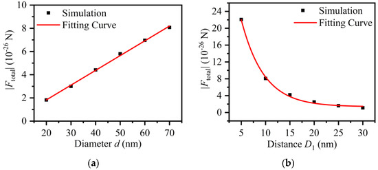To reveal the manipulation ability of near-field induced by the combination of the SNOM probe and AFM probe, the electric field and trapping force exerted on an NP were calculated further. According to the above results, simulations of the single AFM probe irradiated by the VP laser from an SNOM probe were performed first. Figure 5a shows the distribution of the electric field when a silver NP with diameter d = 70 nm was added into the near-field (the distance between the probe tip and the NP was D1 = 10 nm). Similar to the electric distribution of AFM probe without the NP, there is still an evanescent field between the AFM tip and the NP. However, the maximum intensity increases to 19.1 V/m, which is higher than the intensity without an NP. This strong enhancement with nanoscale size will apply an effective force on the silver NP. The intensity of the near-field at the end of the tip, as shown in Figure 1b, demonstrates that the suitable wavelength is still about 717 nm due to the strongest enhancement. Sequentially, based on the Maxwell stress tensor, total trapping force exerted by the near-field was calculated. Figure 5c presents the total force induced by VP laser with wavelength in the range 300 nm–1200 nm. The variations of optical force and electric intensity are highly correlated. So, it can be concluded again that evanescent fields with strong enhancement are the essential conditions for optical manipulation. The maximum force is about 8.2 × 10−26 N (the value does not present the real value, due to the amplitude of the source laser being set to 1). To gain deeper insight into the orientation of the optical force, component forces along the x, y, z axes were plotted in Figure 5d. For the laser wavelength from 600 to 1200 nm, the component force along the z axis is dominant, so that the evanescent field at the tip can trap the NP and move it toward the AFM probe. Optical force per unit volume also confirms this conclusion, as shown in Figure 5e. The red vectors, only at the top of the silver NP, mean that a large force along the z direction is applied. However, in other directions, the disorder and the weak force are incapable of nano-manipulation, as the blue vectors show. So, the forces aroused by the near-field provide a possibility for the expected manipulation of an NP, while controlling the movement of the AFM and SNOM probes or the substrate. However, component force along the x axis is significant in the wavelength range 300–600 nm. This result can be attributed to forming the near-field around the aperture of the SNOM probe; see the distribution of the electric field for the 515 nm laser in Figure S3. These undesirable fields lead to disordered forces along the x and z directions, which will result in ineffective manipulation. So, avoiding the useless effect of the SNOM probe is also critical during manipulation. Then, the capacity of manipulation was evaluated further, varying particle size and the distance between the tip and NP. Figure S4 shows the total force versus wavelength. Here, Figure 6a,b gives the total force as functions of diameter d of an NP and the distance D1, when the wavelength is 717 nm. The optical force is linearly correlated with the diameter, which is similar to other optical trappings [29]. Since the effective area of the near-field is so small, the effect of diameter also reflects the edge shape of the nano-objects on manipulation. Apparently, the smaller curvature of the edge in the effective area causes higher enhancement and corresponding optical force, but the shape out of the effective area has limited influence. Figure S5 shows the larger trapping force of a nano-cube with a size of 70 nm greater than NPs, which confirms the conclusion. However, optical force decays exponentially as the distance increases. It is reasonable because the intensity of electric field also drops exponentially, as shown in Figure 2f. So, trapping ability is sensitively dependent on some critical factors, like the wavelength of the laser, the size and shape of objects, and the distance between probes and objects, which should be investigated further with experiments.