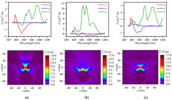 Component forces along x, y, z axis applied on the NP versus wavelength (top diagram) and distributions of electric field in y-z plane (bottom diagram) around dual probe irradiated by polarized near-field laser. (a) ODPs irradiated by HP laser; (b) ODPs irradiated by VP laser; (c) CDPs irradiated by HP laser.