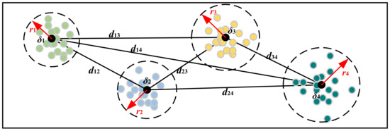 The class aggregation and class separability strategy mean that the data points of each class are as compact as possible, and the distance between classes is as far as possible. Assuming that the same type of data point is drawn on a two-dimensional plane in the form of scattered points, there is usually a circle with the smallest radius to live all the data points. At this time, the center of this circle can be regarded as the fitting center point of this type of data, and the radius of this circle can be called the class radius r of this data type. According to this idea, assuming that there are N classes and the i-th class has group data , the class fitting center point and class radius of the i-th class are defined as: