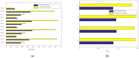 The experimental results of HSDAE with hierarchical strategy and non-hierarchical strategy in data sets A, B, C and D are shown in Figure 8. Among them, in Figure 8a represents the KL divergence of the neurons in the x-th hidden layer. From the results in the figure, the hierarchical sparsity strategy has a significant impact on the sparsity of the first layer of neurons and the second layer of neurons because the KL divergence value of the hierarchical strategy is smaller than that of the non-hierarchical strategy. Although the KL divergence values of neurons in the third layer have little difference, the overall KL loss hierarchical strategy is smaller than that of the non-hierarchical strategy, as shown in Figure 8b. In short, the measurement results of the sparsity of neurons in each layer show that the hierarchical sparsity strategy can adjust the sparsity of each layer of a multi-layer network and enhance the sparsity of the network.