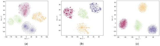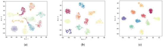 In order to test the effects of class aggregation and class separability strategy, the t-SNE method is used to visualize the dimensionality reduction in the feature layer extracted by the model. The test methods are the complete HSDAE method and the HSDAE method without discriminant distance, using the optimal hierarchical sparse parameters. Then, the experimental results of the above two methods in data set C are selected and visualized by the t-SNE method. In Figure 9a, the original data overlaps and is chaotic, and the classification effect is not good. The HSDAE method without discriminant distance in Figure 9b can effectively separate all classes, and only a small amount of data is misclassified, but the uniformity and aggregation of the data points are poor. The HSDAE method in Figure 9c can not only separate all classes but also enhance the aggregation of each class. The data points are more evenly distributed and have good feature extraction capabilities. In summary, the class aggregation and class separation strategy can effectively enhance the aggregation of data classes and increase the distance between data classes. The experimental results reflect the excellent classification performance of the HSDAE method.